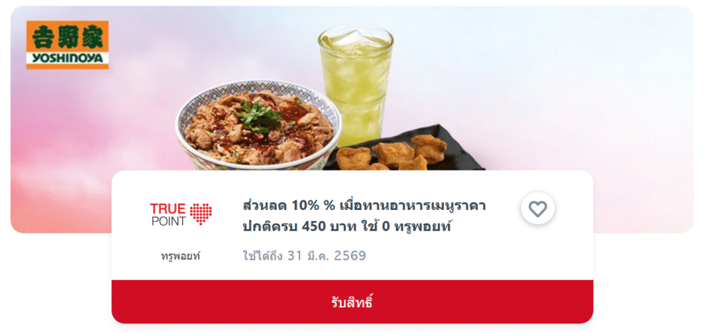 ลูกค้าทรู (True Black, True Red, True Blue หรือ True Green) มีสิทธิพิเศษเมื่อทานที่ร้าน Yoshinoya เมื่อทานครบ 450 บาท สำหรับเมนูอาหารและเครื่องดื่มราคาปกติ จะได้รับ ส่วนลด 10% ทันที จากโปร (TrueYou / TrueID Privilege)